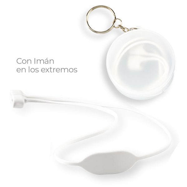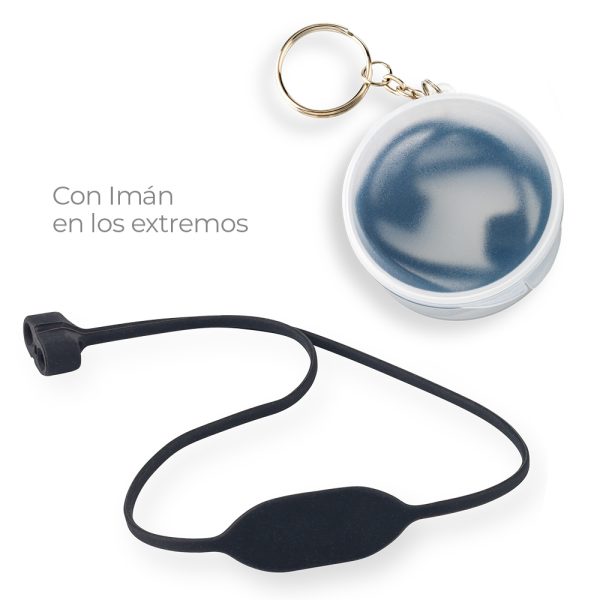Accesorio elaborado en silicona para colocar en el cuello, con orificios en los extremos para colocar audífonos o las gafas y evitar que se extravíen. Pieza magnética en cada punta para mantenerse en su sitio. En estuche plástico para cargar con argolla tipo llavero.