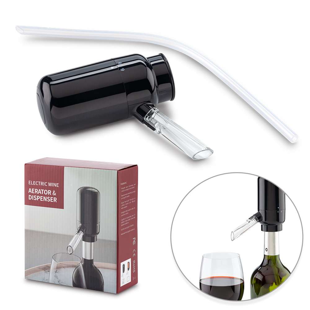 Dispensador de vino que integra el proceso de aireado en un solo producto presionando el botón. 4 pilas AAA no incluidas. Empaque Caja Individual.