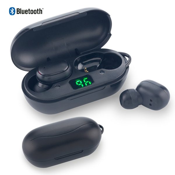 Audífonos inalámbricos plásticos Bluetooth. Funciona como manos libres. Resistente a la humedad. Hasta 5 horas de carga. Con estuche portátil de recarga y display que muestra el porcentaje de carga.