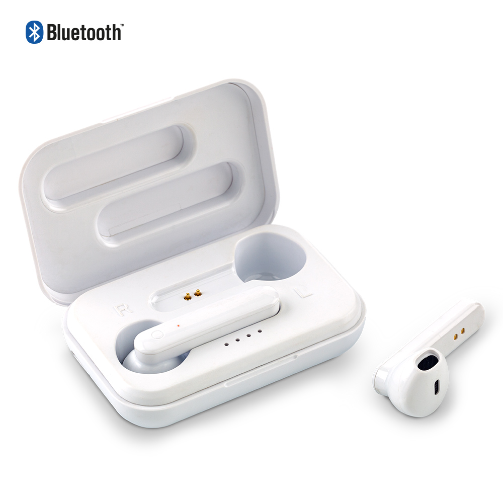Audífonos inalámbricos plásticos Bluetooth. Con estuche imantado portátil de recarga que muestra el nivel de carga. Capacidad de la batería: 30mAh / 300mAh. Tiempo de trabajo: 2,5 horas. Versión de Bluetooth: V5.0. Rango de transmisión: 2,4 GHz-2,48 GHz. Línea de transmisión:> 10 M. Funciona como manos libres. Empaque caja individual.