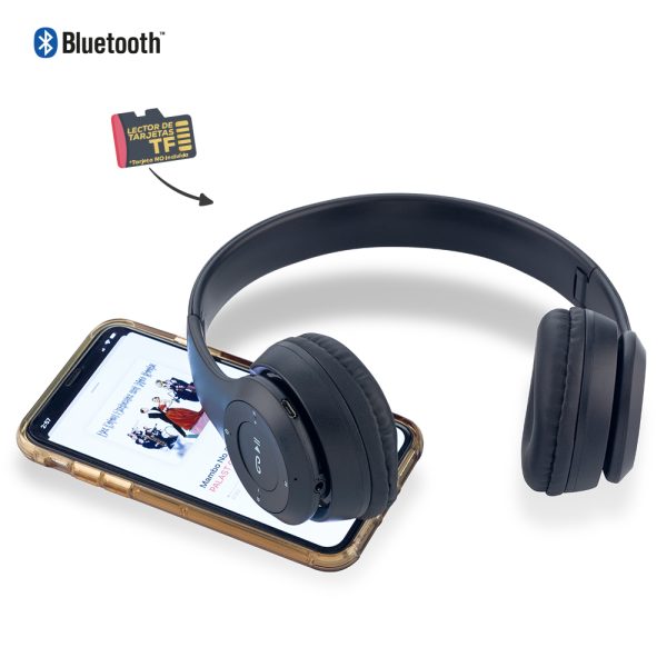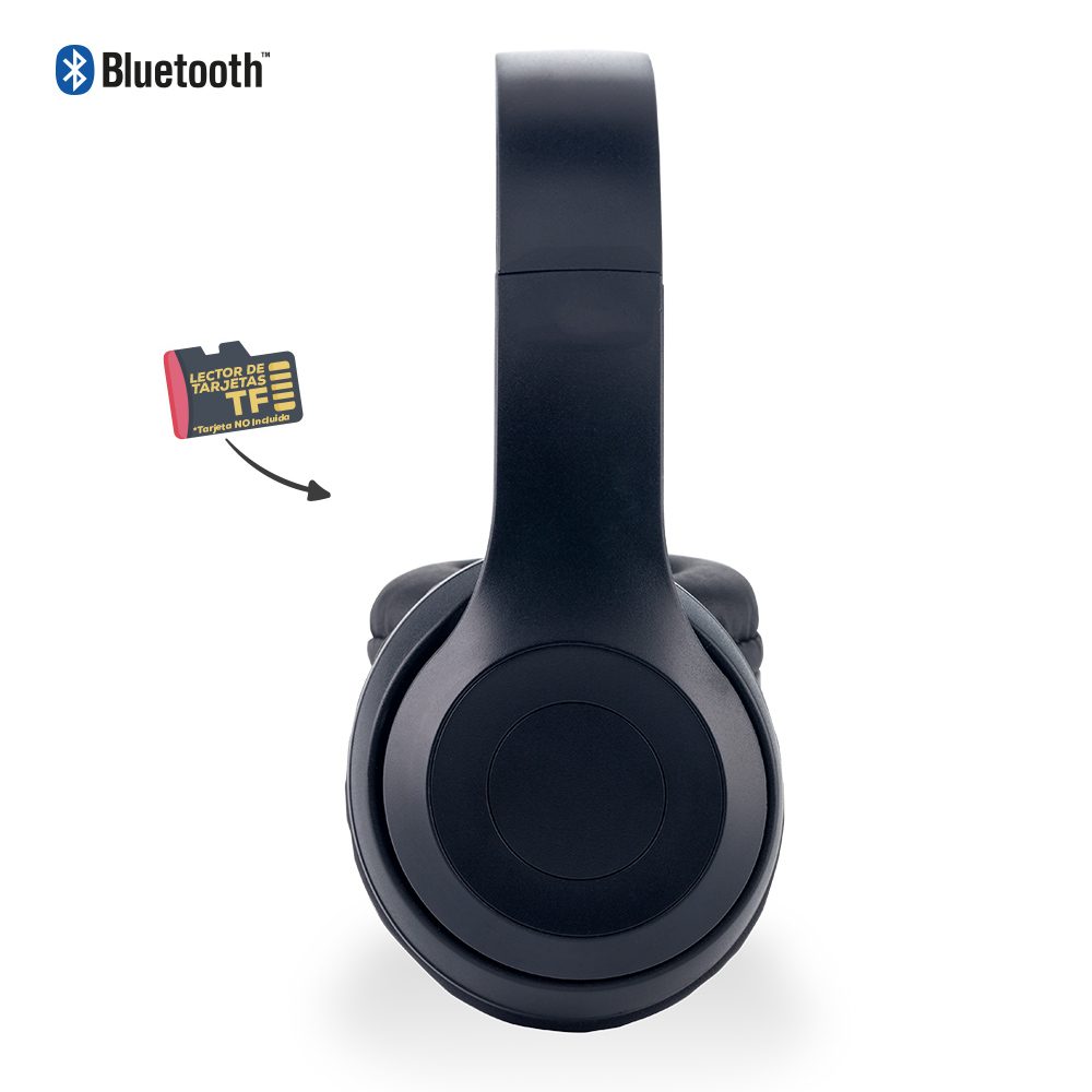 Audífonos Bluetooth plásticos tipo Headphone con auriculares acolchados. Bluetooth 4.2. Tiempo de carga 1.5h aprox. Tiempo de reproducción 3h aprox. Batería 200mAh de capacidad. Función para tarjeta TF (Tarjeta no incluida) y AUX. Funciona como manos libres. Empaque caja individual.