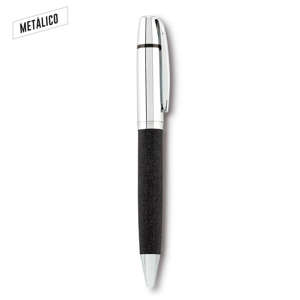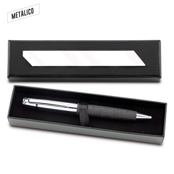 Bolígrafo metálico en estuche de cartón. Mecanismo Twist. Empaque caja individual. Medidas: 14 cm . Marca: 2 cm / Láser