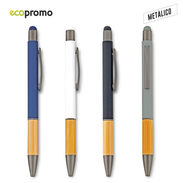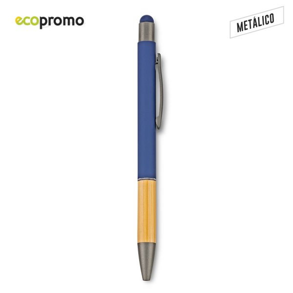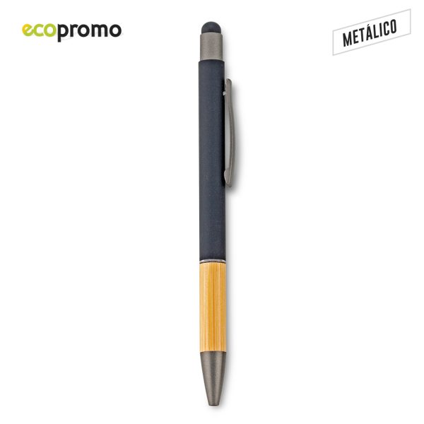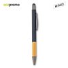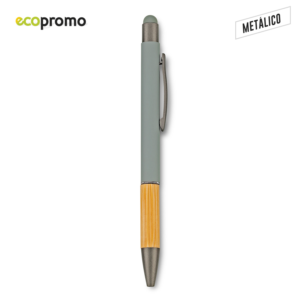 Bolígrafo metálico con stylus. Acabado caucho. Mecanismo push. Parte inferior con bambú natural.