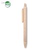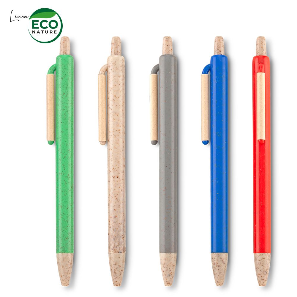Bolígrafo plástico elaborado con fibra de trigo (50% aprox). El porcentaje de material ecológico tiene un promedio de biodegradabilidad de 2-3 años después del fin de su vida útil. Clip de cartón. Mecanismo push.
