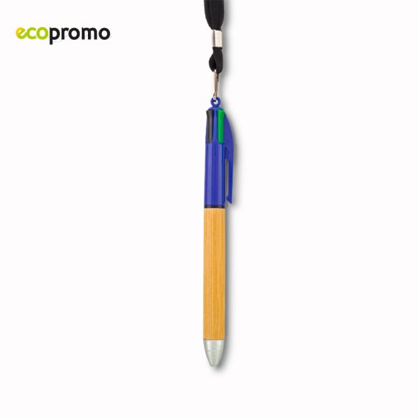 Bolígrafo plástico con barril en bambú. Cuatro minas: Roja, Azul, Negro y Verde. Incluye cuerda para colgar.