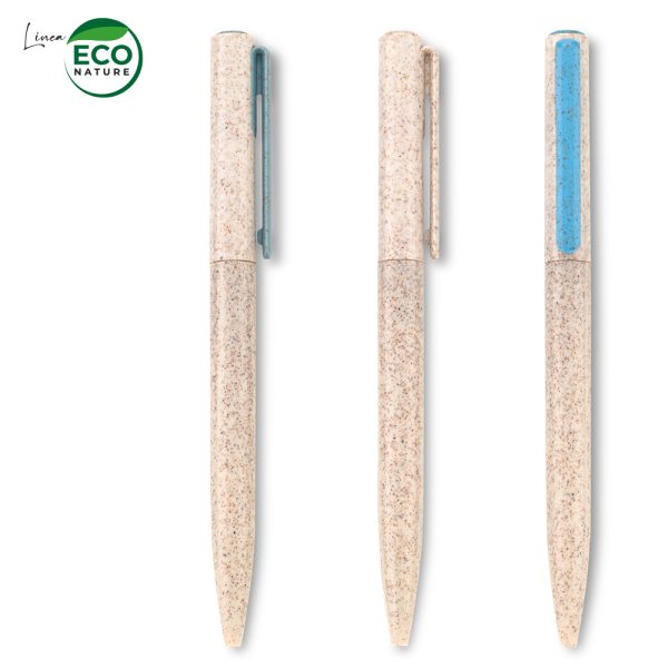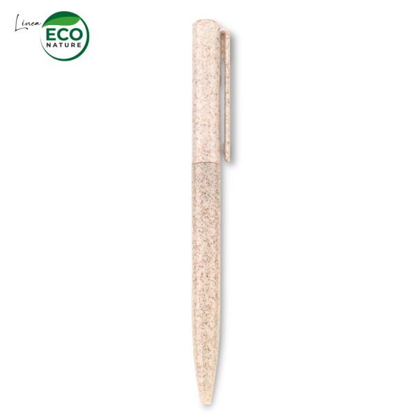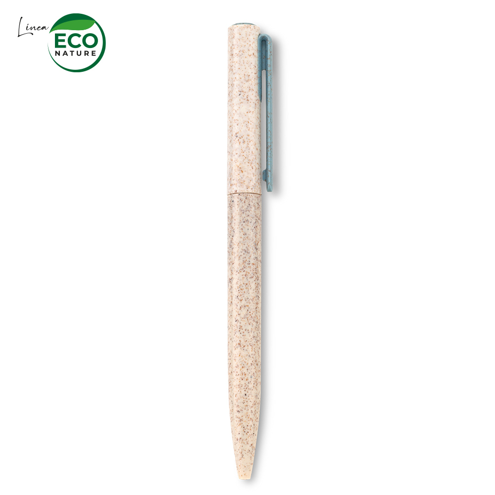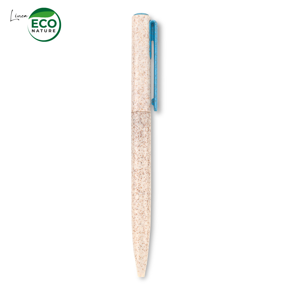 Bolígrafo plástico. Mezcla con material ecológico en fibra de trigo (50%-60% aprox). El porcentaje de material ecológico tiene un promedio de biodegradabilidad de 2-3 años después del fin de su vida útil. Mecanismo Twist.