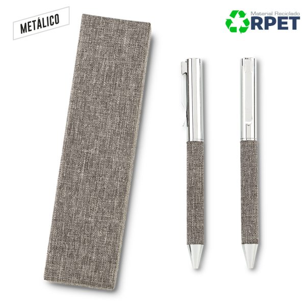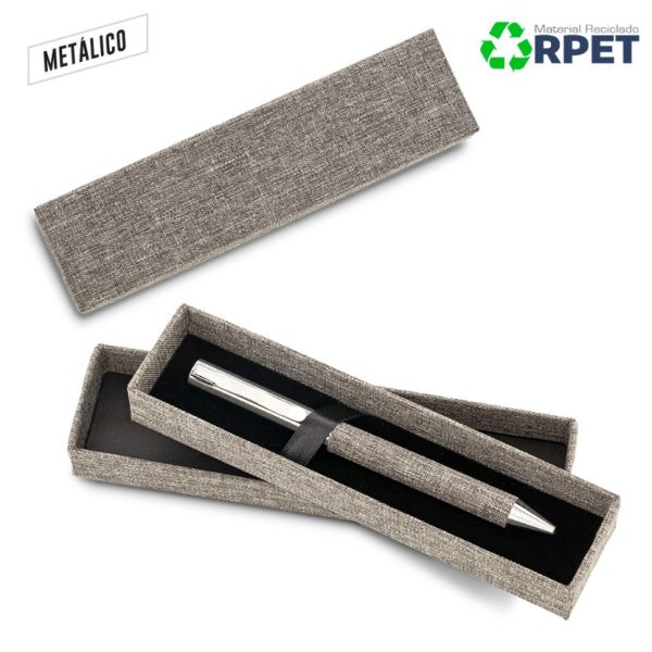 Bolígrafo metálico con grip en poliéster RPET. Estuche de cartón forrado con poliéster RPET. Mecanismo Twist.