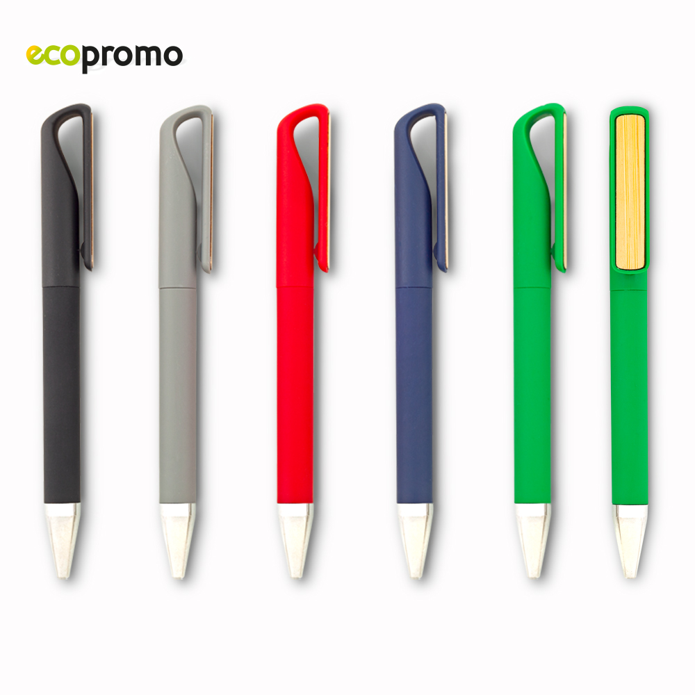 Bolígrafo plástico cubierto en goma. Clip bambú. Mecanismo twist.
