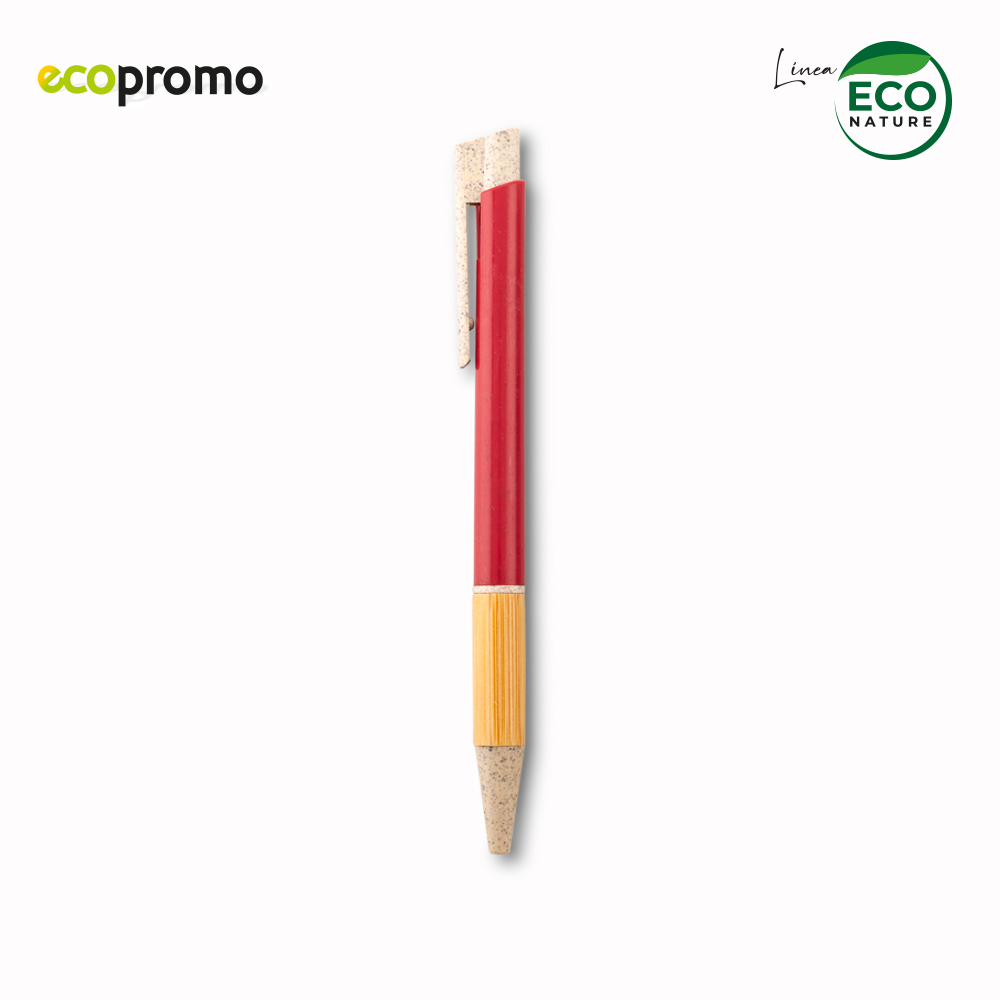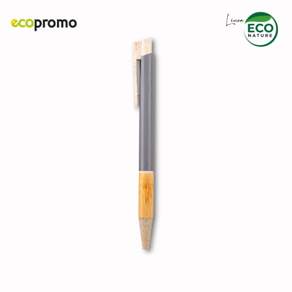 Bolígrafo plástico con grip de bambú. Mecanismo push. Mezcla con material ecológico en fibra de trigo (50%-60% aprox).El porcentaje de material ecológico tiene promedio de biodegradabilidad de 2-3 años después del fin de su vida útil.