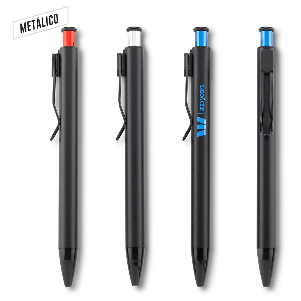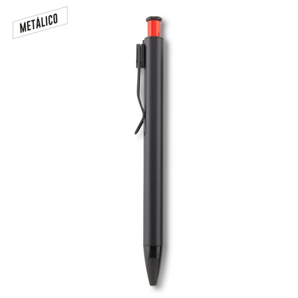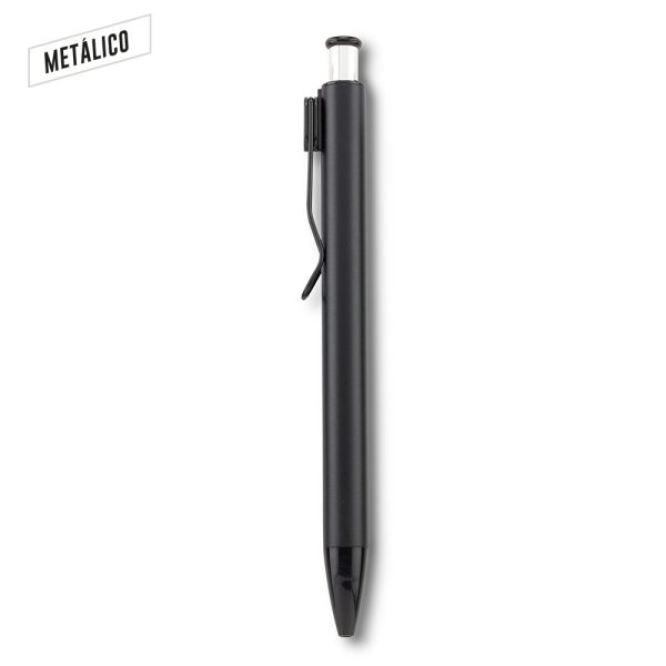 Bolígrafo metálico con partes plásticas. Clip metálico, mecanismo push. Puede ver el logo del mismo color del pulsador al marcar en láser.