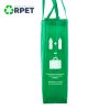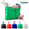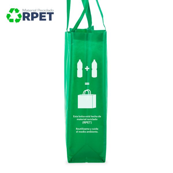 Bolsa fabricada 100% RPET (PET reciclado de botellas de agua) y manijas largas, laminado mate. Con costuras de refuerzo en X en las manijas. 100% ecológica.