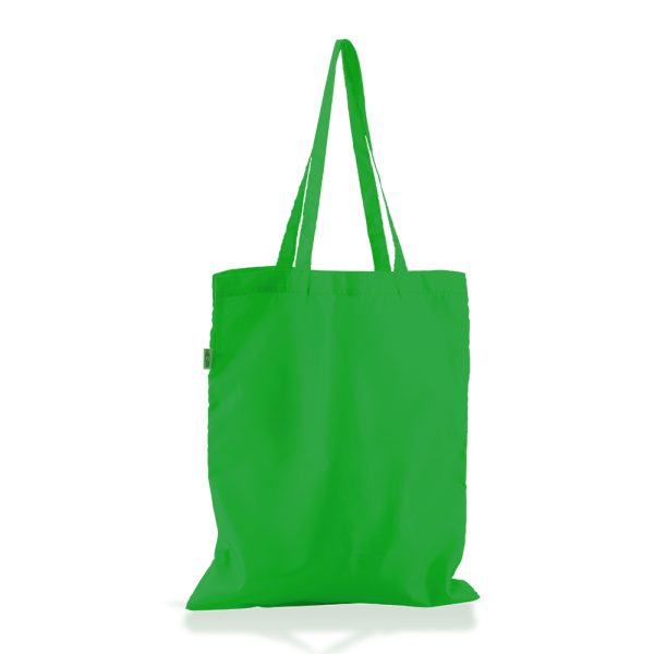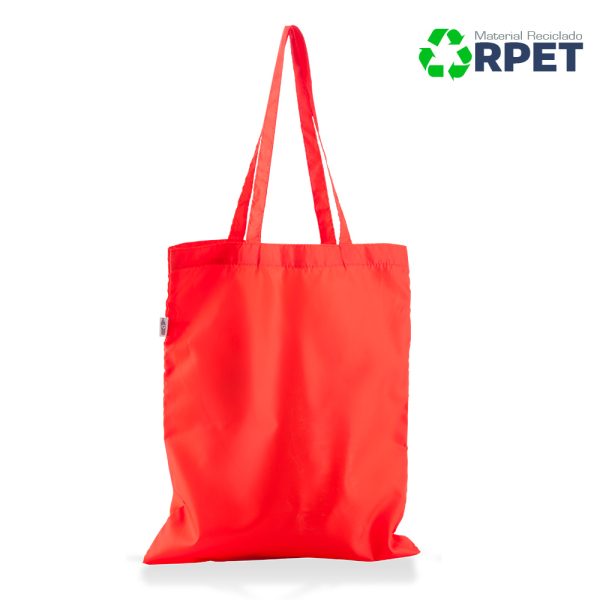 Bolsa fabricada 100% RPET (PET reciclado de botellas de agua) y manijas largas. 100% ecológica.