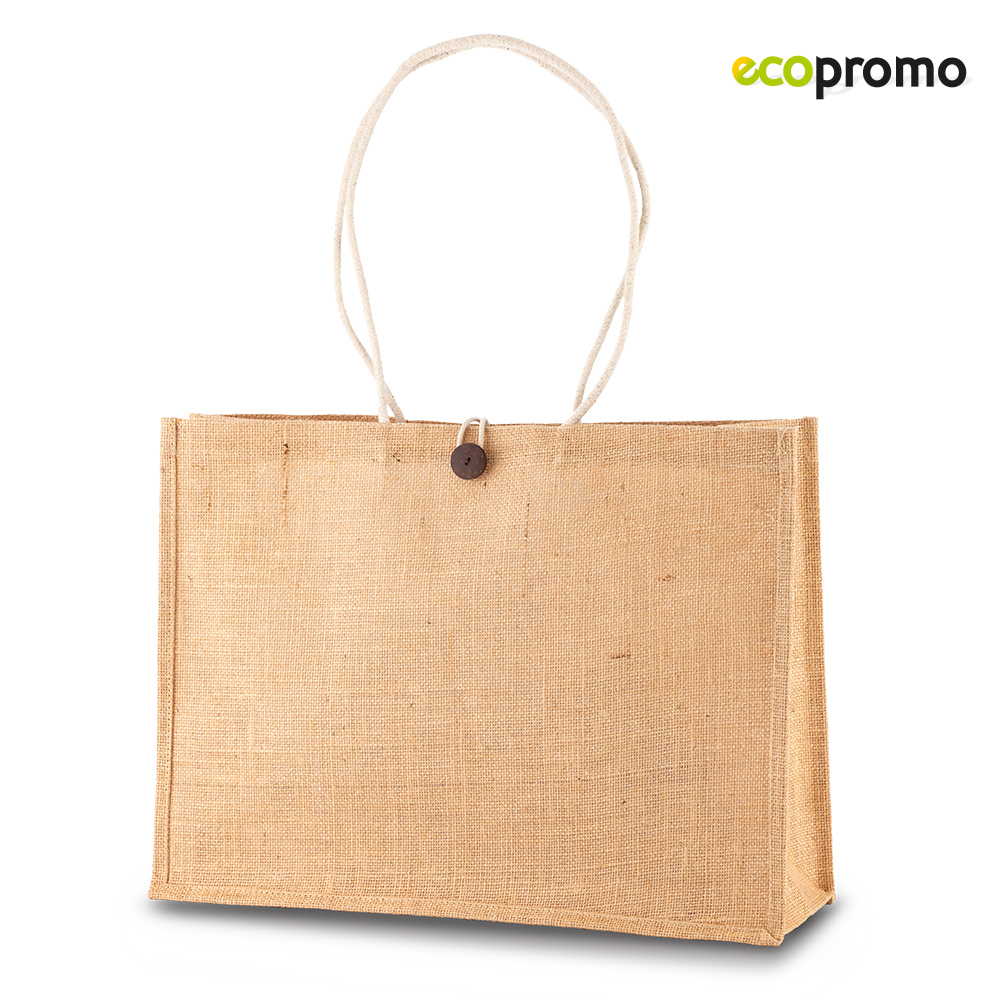 Bolsa en Yute con agarradera de cordón y cierre de botón.