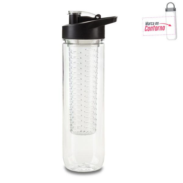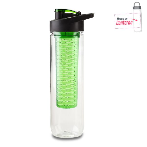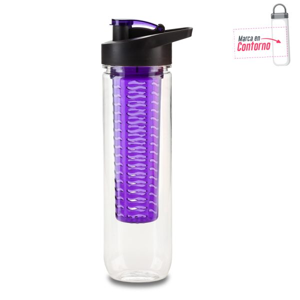 Botilito en Policarbonato con infusor plástico incorporado para frutas, cuerpo transparente con infusor interno en colores. Se recomienda usar con agua fría o ligeramente tibia.