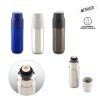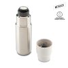 Botilito doble pared vacuum en acero inoxidable, con aislamiento térmico que mantiene la bebida fría o caliente hasta 6h, aprox (puede variar dependiendo condiciones climáticas). Una tapa plástica con función rosca y regulador para servir las bebidas. Una tapa plastíca la cuál funciona como vaso. Empaque caja individual.