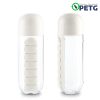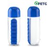 Elaborado en plástico reciclado PETG. Material de alta transparencia, mayor firmeza y durabilidad, libre de BPA, resistente al desgaste e impactos menores y reciclable. Mantiene líquidos tibios hasta 60°C. Tapa de rosca y pastillero plástico semanal.