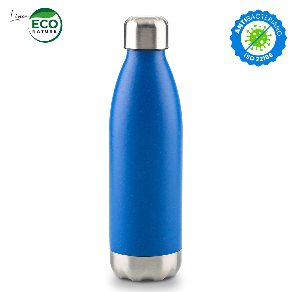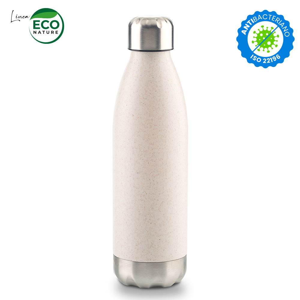 Botilito plástico mezclado con material ecológico en fibra de trigo (50%-60% aprox). Tapa metálica con interior plástico. El porcentaje de material ecológico tiene un promedio de biodegradabilidad de 2-3 años después del fin de su vida útil.