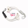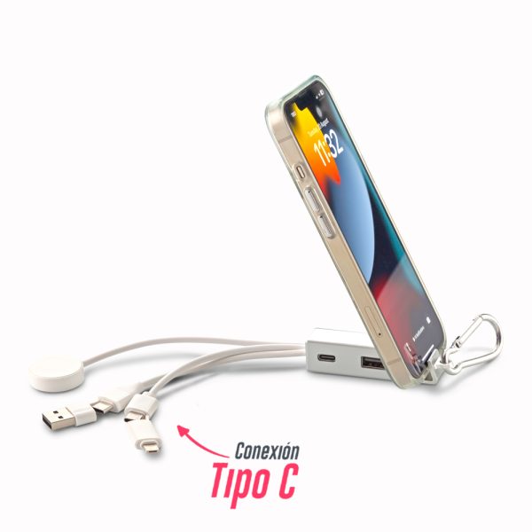 Cable multicargador. Con puertos Tipo USB y Tipo C. Cables con conectores lightning, Tipo C y USB. Cargador para Smart Watch. Con soporte para celular y gancho carabinero.