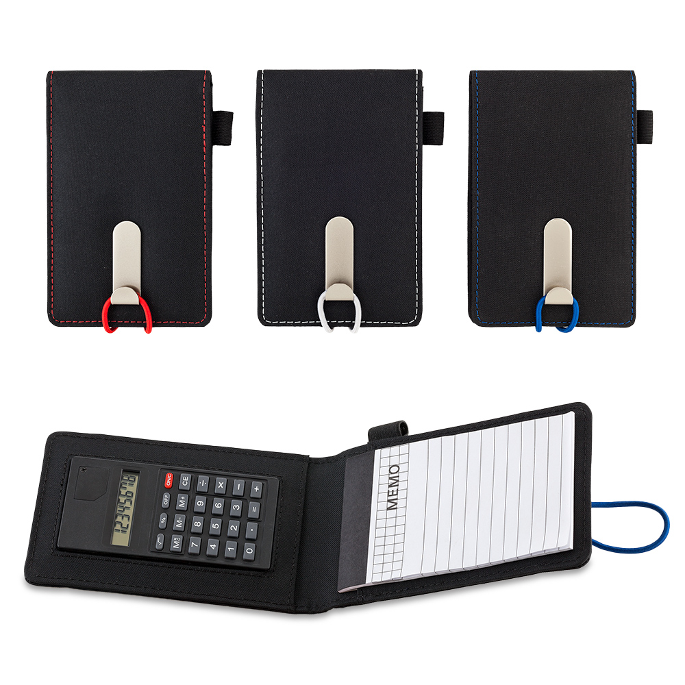 Funda en poliéster, calculadora interna de 8 dígitos, block de papel,
