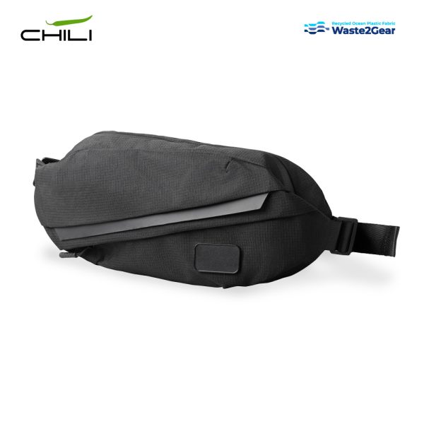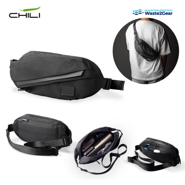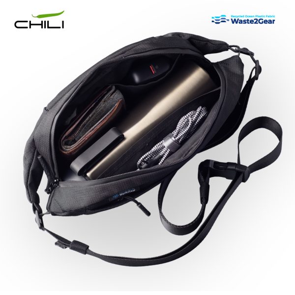 Canguro elaborado con poliéster tejido de plástico marítimo reciclado. Tres compartimentos con cierre de cremallera. Incluye placa metálica para marcar.
