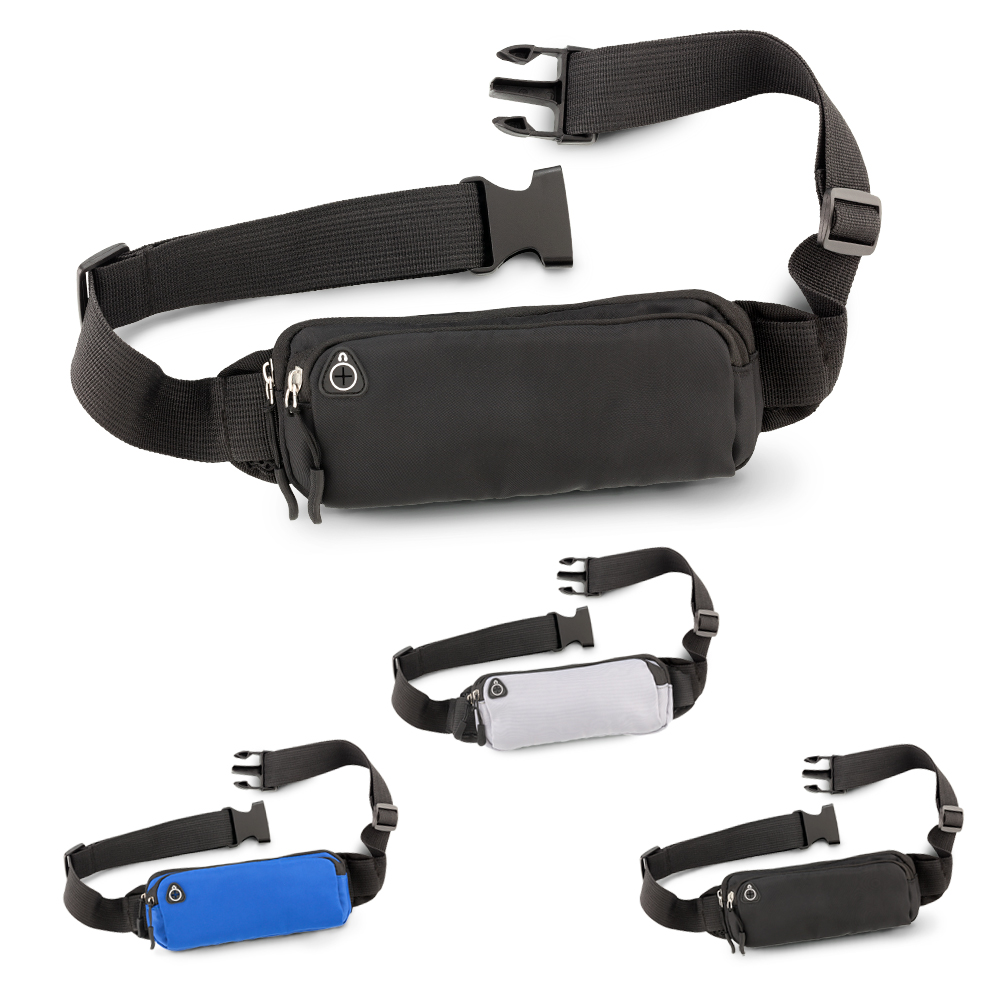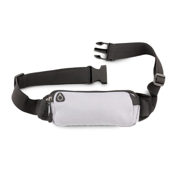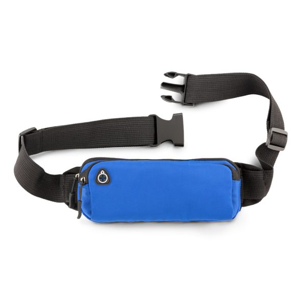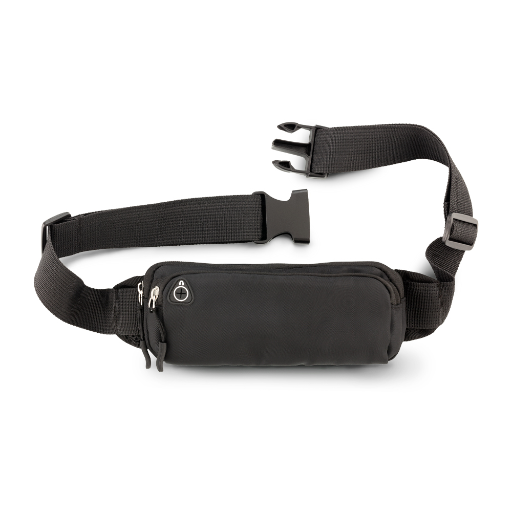 Canguro en poliéster. Dos bolsillos externos con cremallera y salida para audífonos.