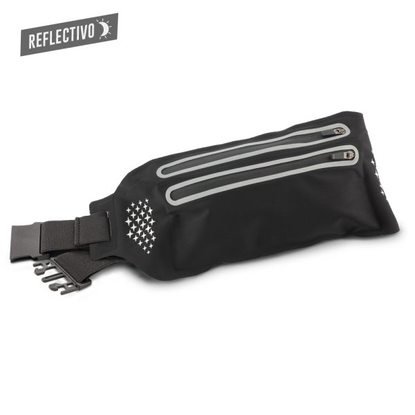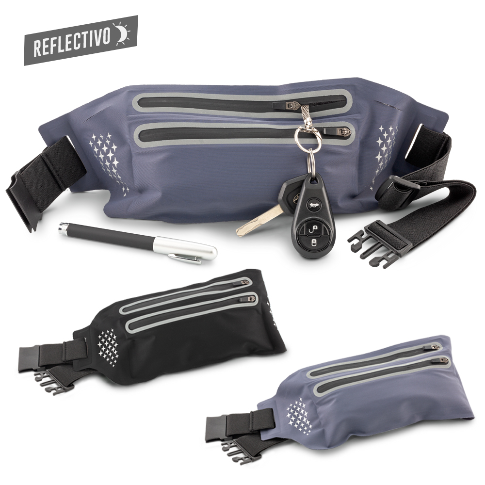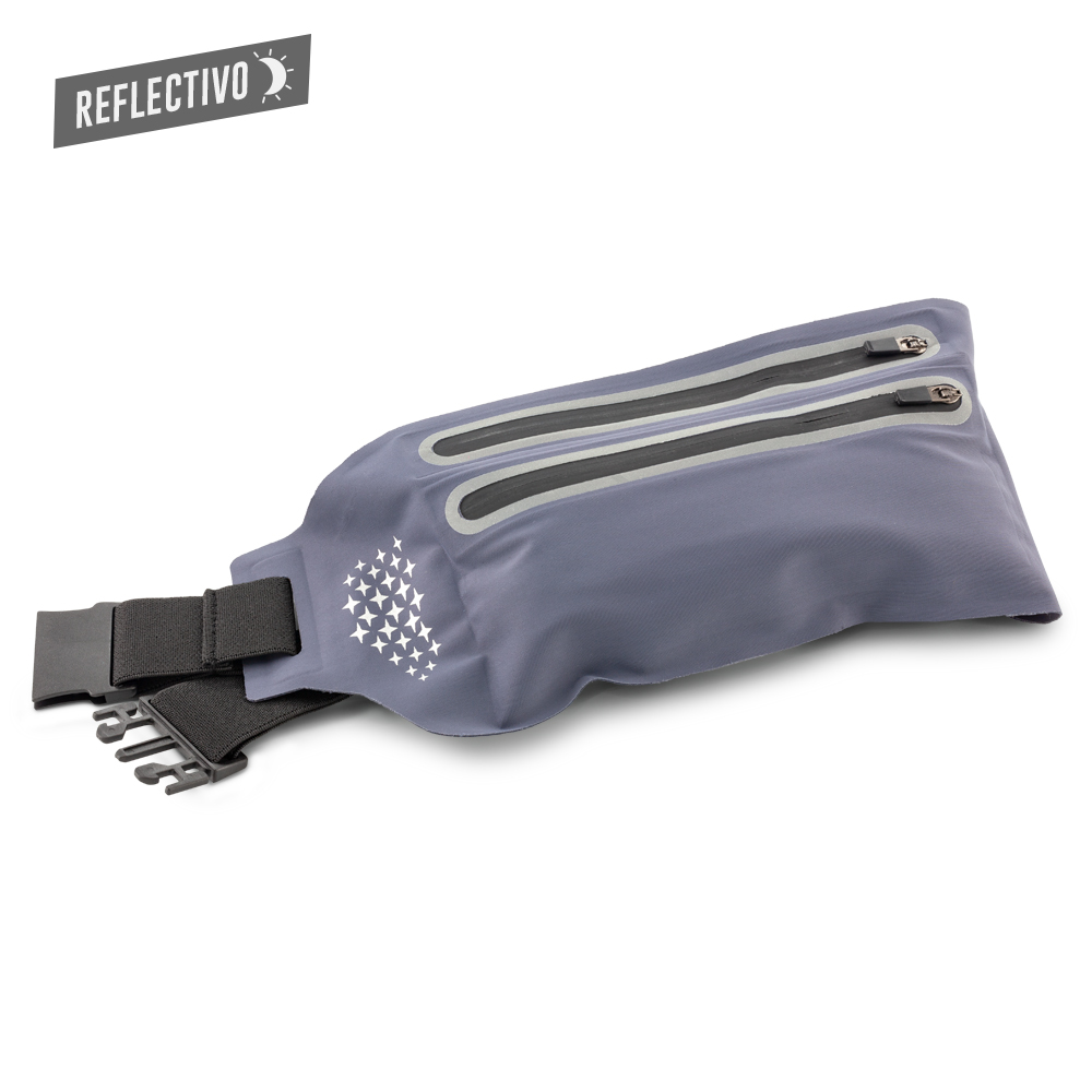 Canguro en poliéster. Dos bolsillos externos con cremallera y banda reflectiva.