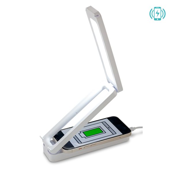 Lámpara de escritorio, con 3 modos de iluminación, con cargador inalámbrico de 10W. Funciona con dispositivos móviles compatibles con esta tecnología, (debe conectarse con el cable provisto). Escualizable. Empaque caja individual.