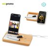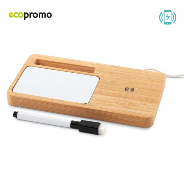 Cargador inalámbrico en bambú de 5W con soporte para celular y mini tablero con marcador borrable. Incluye cable con doble conexión para carga, Tipo C y Tipo USB. Empaque caja individual.