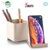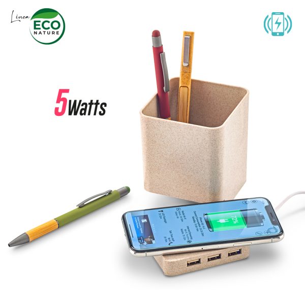 Cargador inalámbrico de 5W en la base, plástico con material ecológico de fibra de trigo, portabolígrafos y 3 salidas USB (aptos para carga y para transmisión de datos cuando se usa con el cable que está incluido). Empaque caja individual.