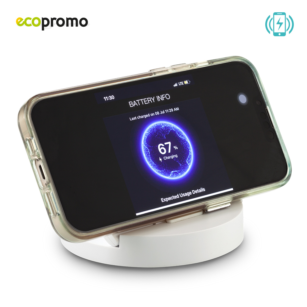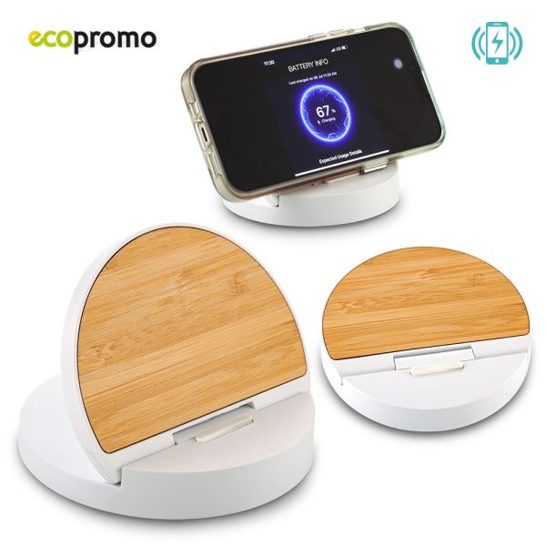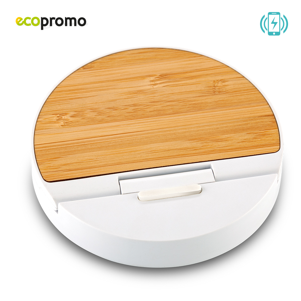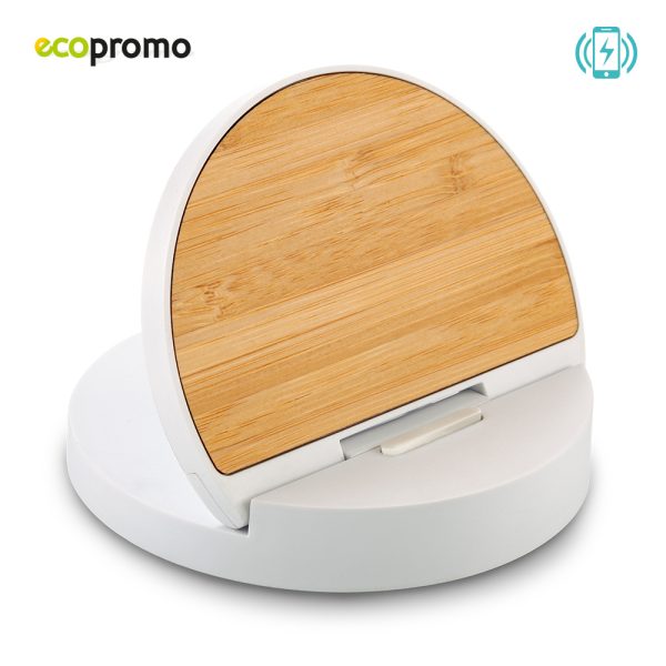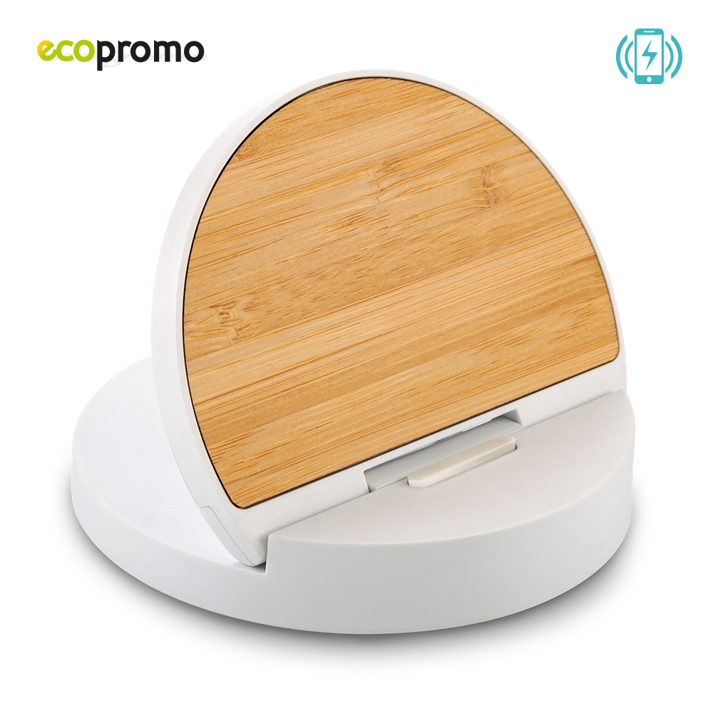 Cargador inalámbrico plástico de 10W con soporte para móviles y partes de bambú. Base antideslizante. Compatible con dispositivos equipados con tecnología de carga inalámbrica. Cable USB incluido. Empaque caja individual.