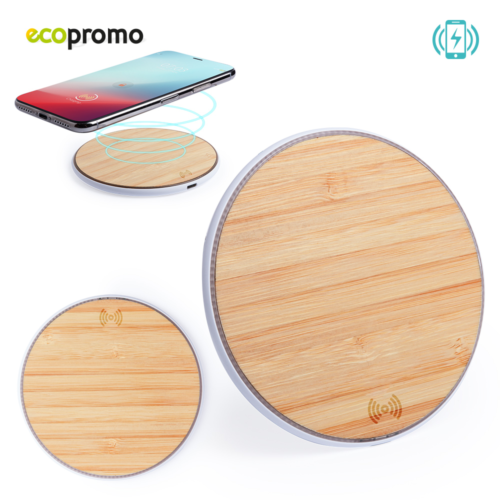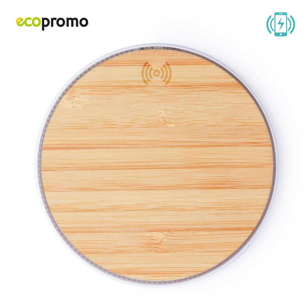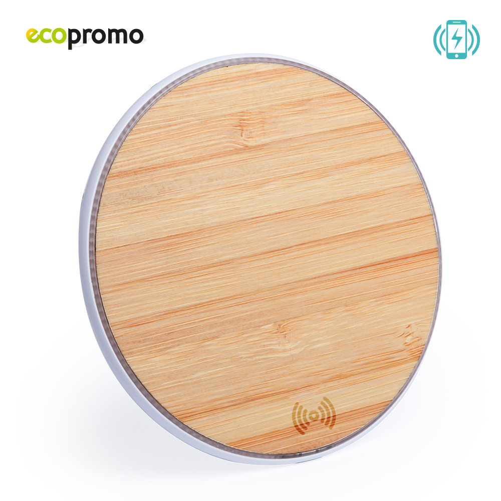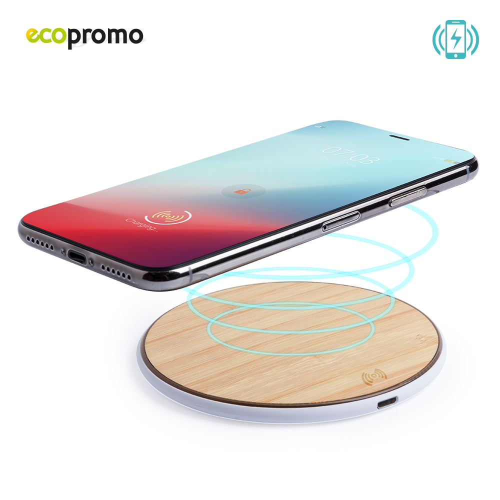 Cargador inalámbrico de línea nature, con base de carga en madera de bambú. Base antideslizante y compatible con dispositivos equipados con tecnología de carga inalámbrica, 5-10W. Input: 5-9V/2-1.67A, Output: 5-9V/1-1.1, cable USB incluido. Empaque Caja Individual.