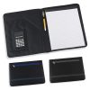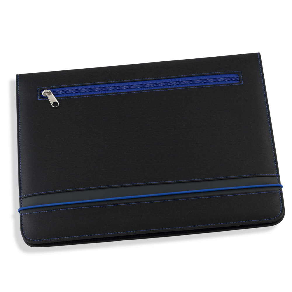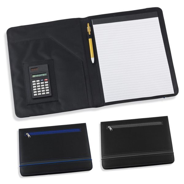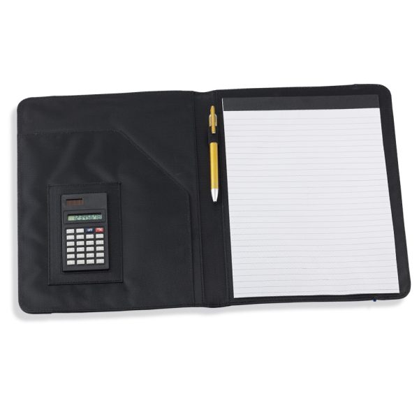 Estuche en poliéster con cierre en banda elástica, bolsillo interno con solapa para documentos, calculadora solar de 8 dígitos, sujetador para bolígrafo, anotador y en la parte exterior bolsillo con cierre en cremallera. (No incluye bolígrafo).