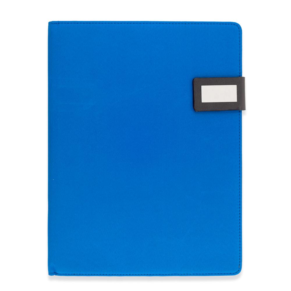 Folder en microfibra con cierre de imán. Incluye block de papel, 4 portatarjetas, funda portacelular y 2 elásticos multiorganizadores. No incluye bolígrafo.
