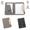Folder tamaño A4 en poliéster reciclado RPET. Block de notas de 20 hojas con rayas. Cuatro compartimientos internos para trajetas y un compartimiento interno para documentos. Cierre en bambú con imán. Empaque caja individual.
