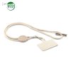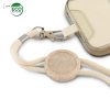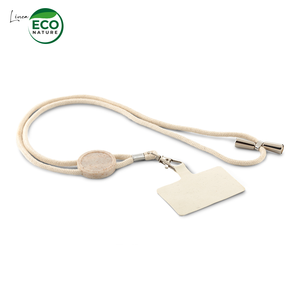 Cinta portacarnet en algodón con gancho metálico y partes en plástico ecológico de fibra de trigo. Con tarjeta para insertar en forro del móvil.
