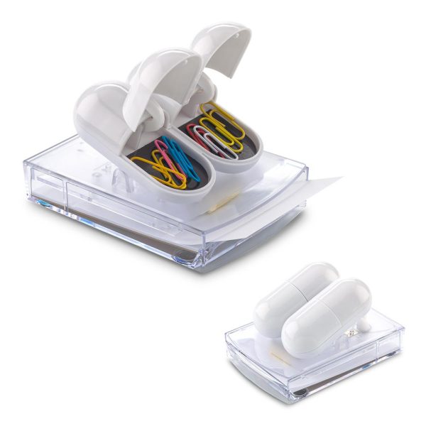 Dispensador plástico de papel con capacidad para 30 hojas aproximadamente de 7.5 cm x 10 cm. Incluye papel. Empaque Caja Individual.
