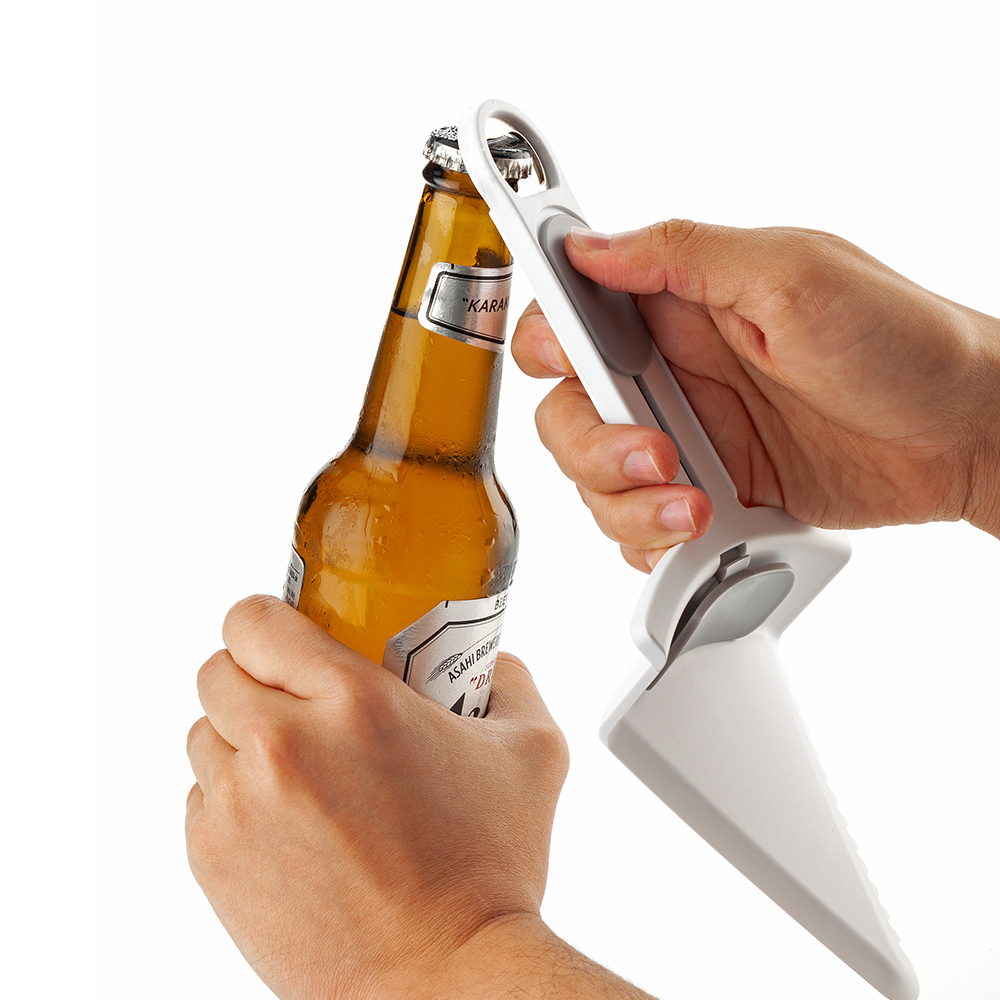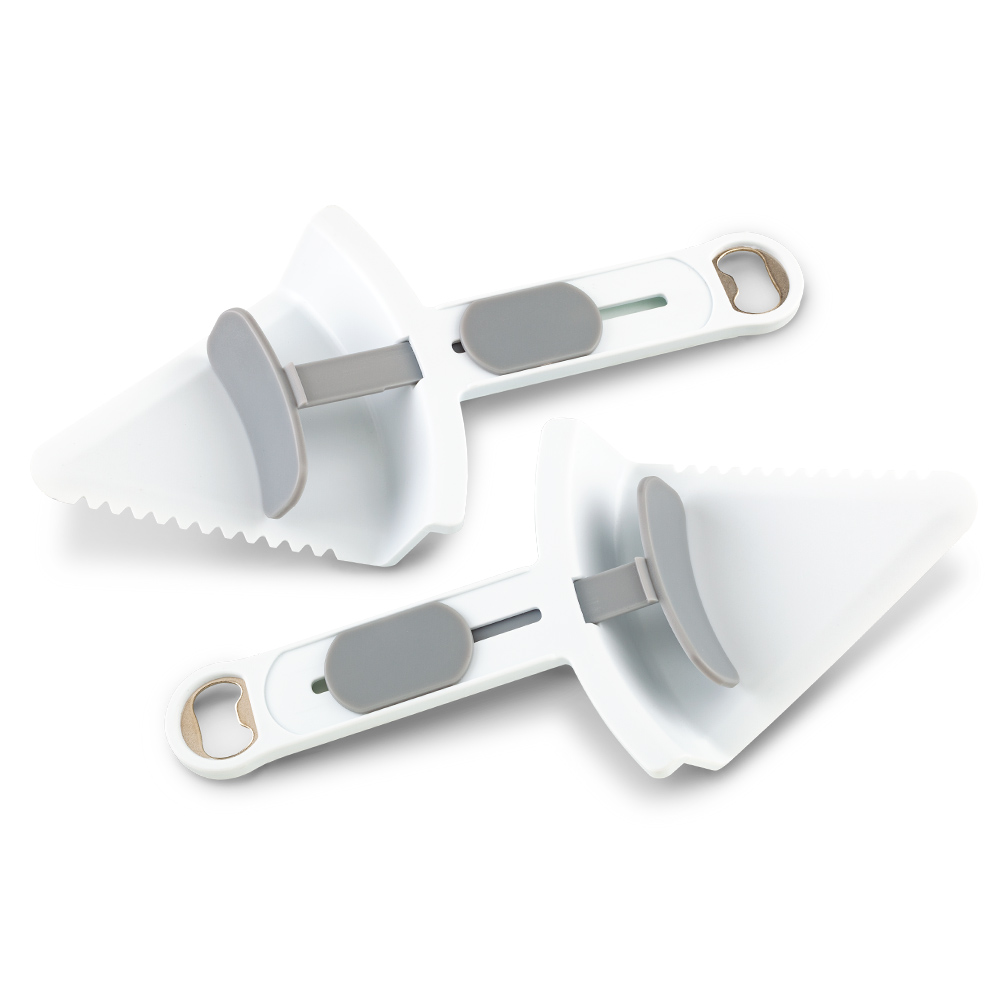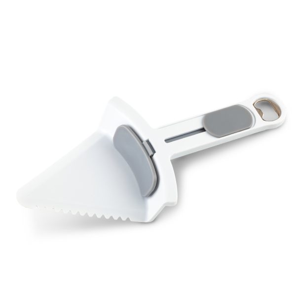 Espátula plástica de servir con un borde con sierra que corta sin necesidad de utilizar otra herramienta. Duradero, resistente y fácil de limpiar. Destapador de botellas por un extremo. Con el botón deslizable, usa una sola mano para servir sin necesidad de tocar la tajada. También lo puede usar para cortar pasteles, tortas, etc.