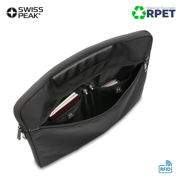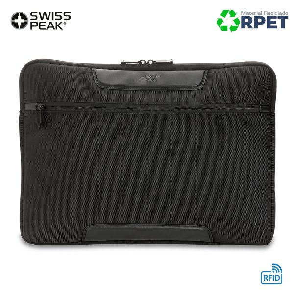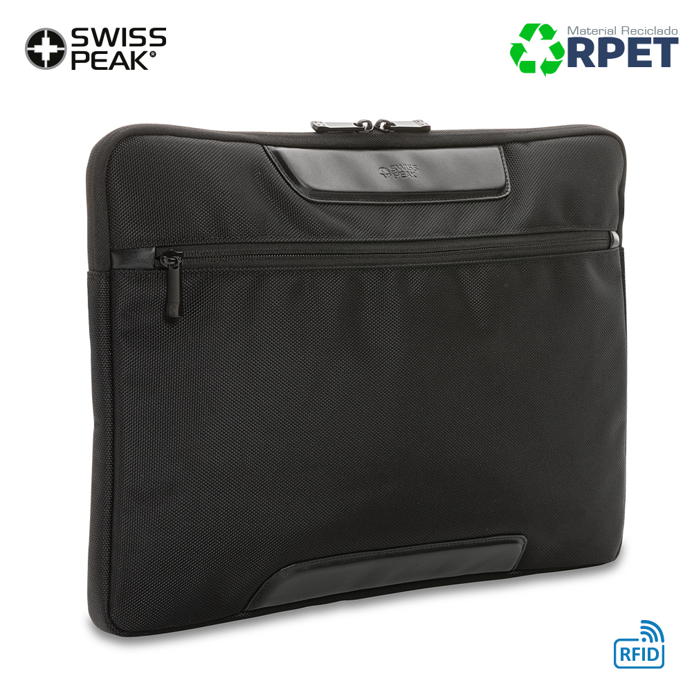 Funda portalaptop acolchada para portátiles de hasta 15.6”. Fabricado con poliéster RPET. Su material interno permite bloquear las señales electromagnéticas RFID (Radio Frequency Identification) que se usan en tarjetas de chip, pasaportes, tarjetas electrónicas de transporte, etc.Bolsillo frontal con cremallera, dos bolsillos internos.