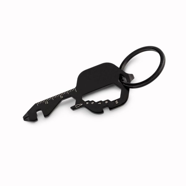 Multiherramientero metálico con llavero. 13 funciones, algunas de ellas son: destornillador plano y de estrella, llave para tuercas hexagonales de 5 tamaños diferentes, regla, destapador, entre otras. Empaque caja individual.