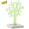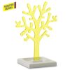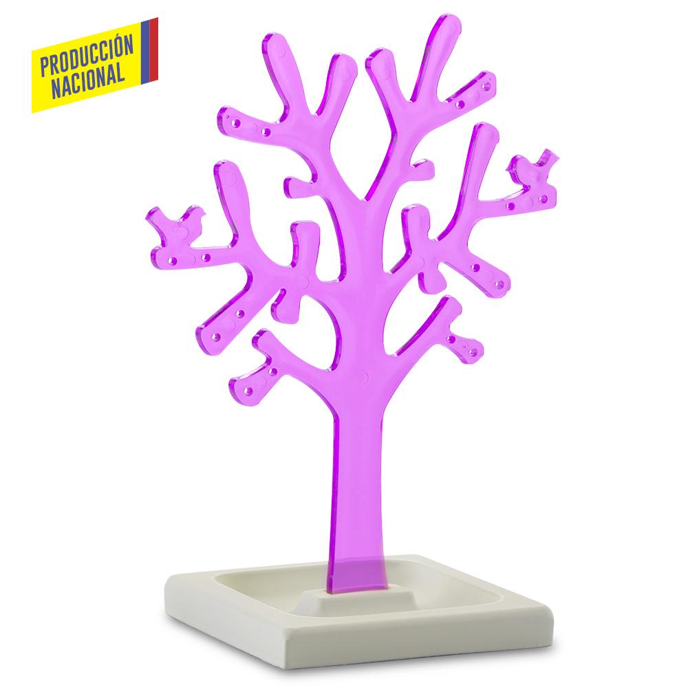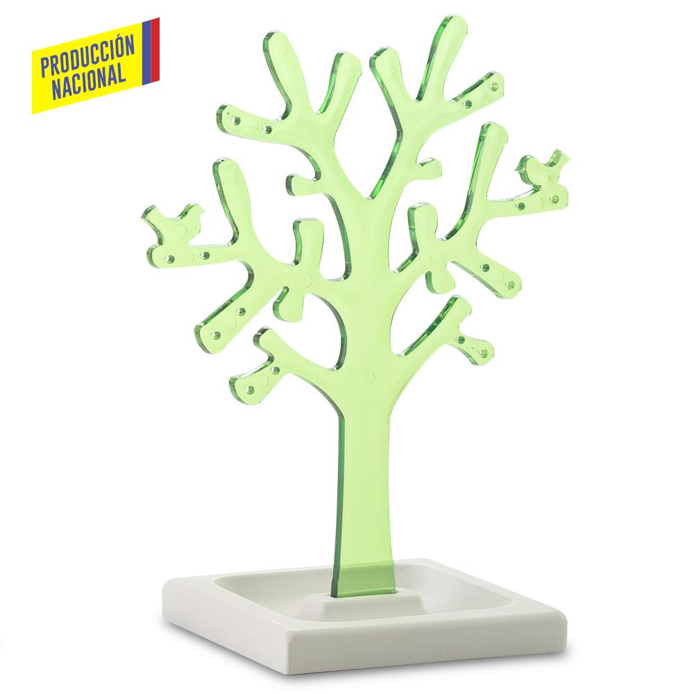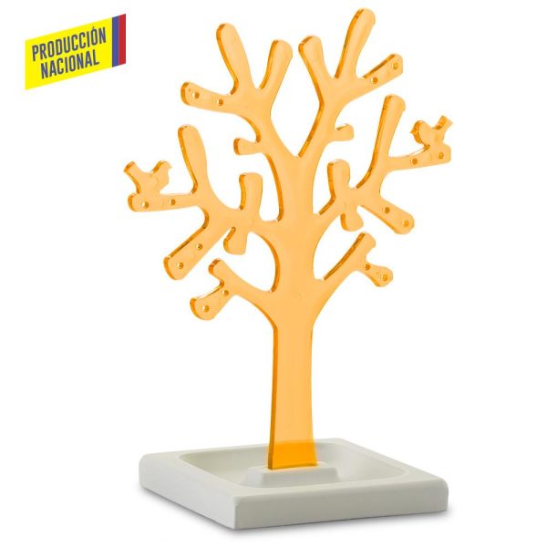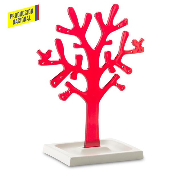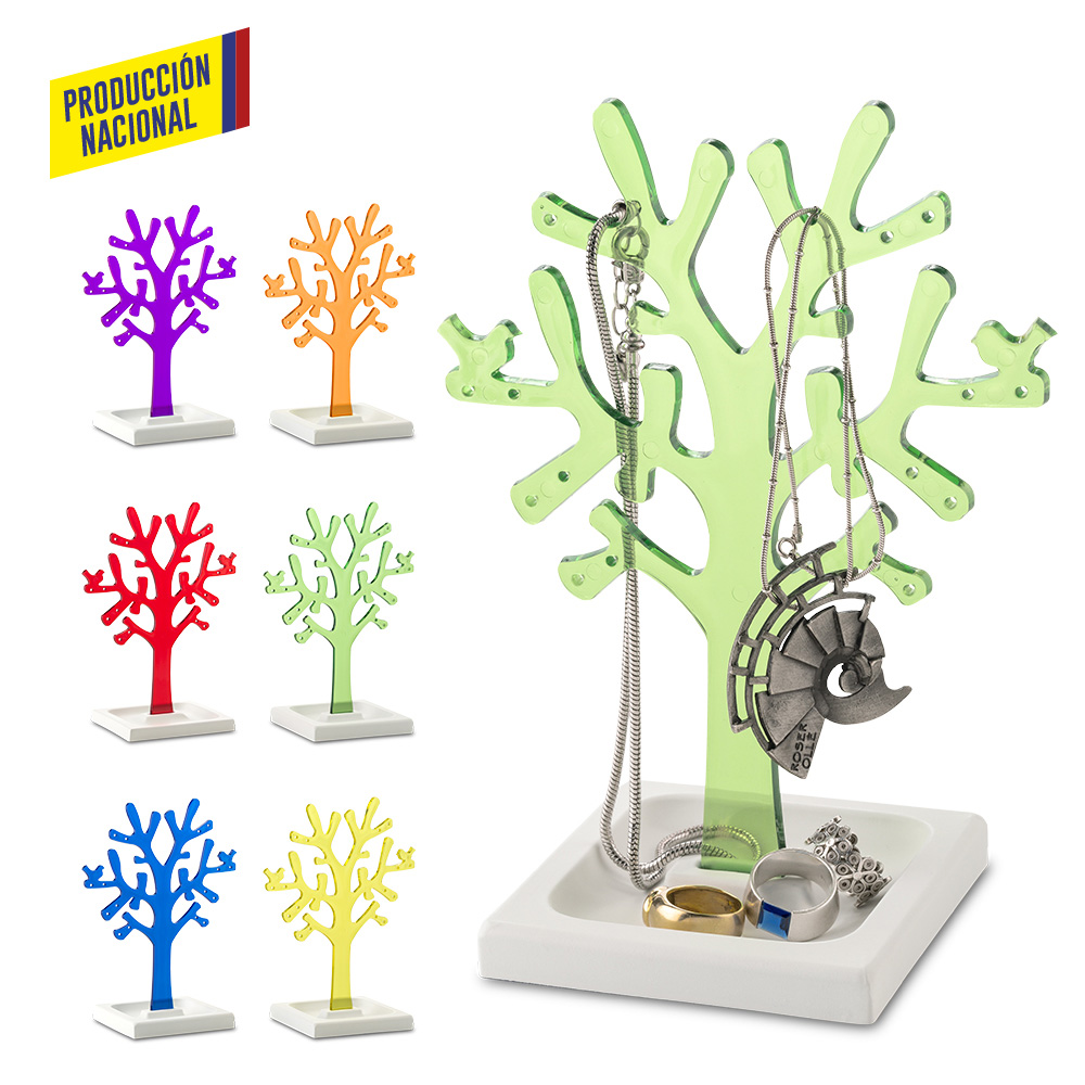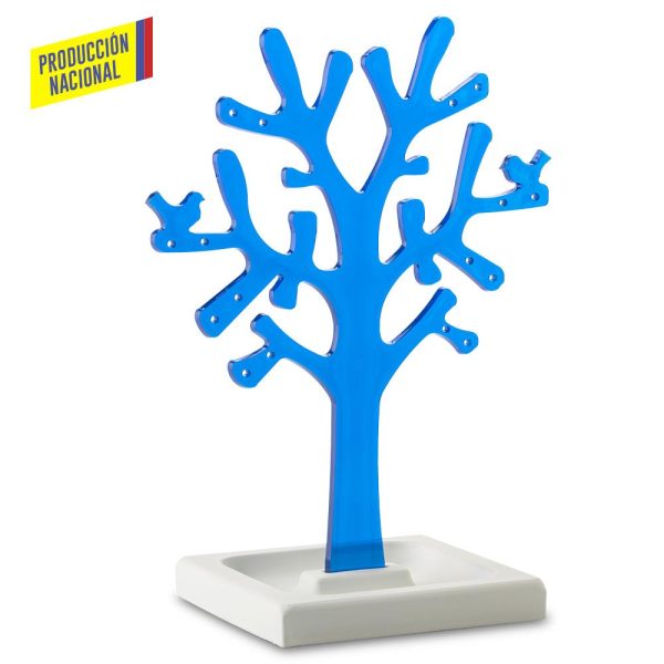 Árbol en poliestireno cristal con orificios para colocar aretes, base en MDF pintada en laca catalizada de color blanco. Empaque Caja Individual.