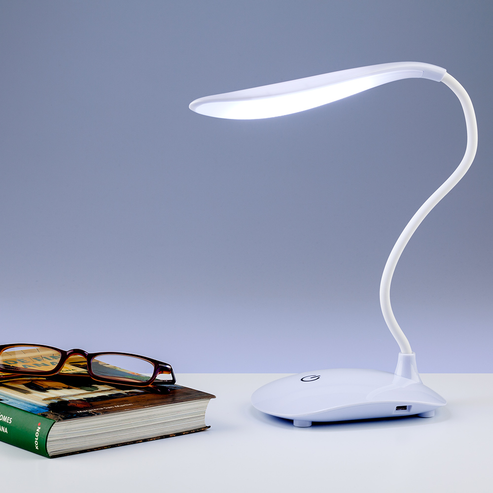 Lámpara de luz LED con cuello flexible. 3 modos de luz. Funciona con 3 baterías AA (no incluidas) y/o conexión a puerto USB. Empaque Caja Individual.