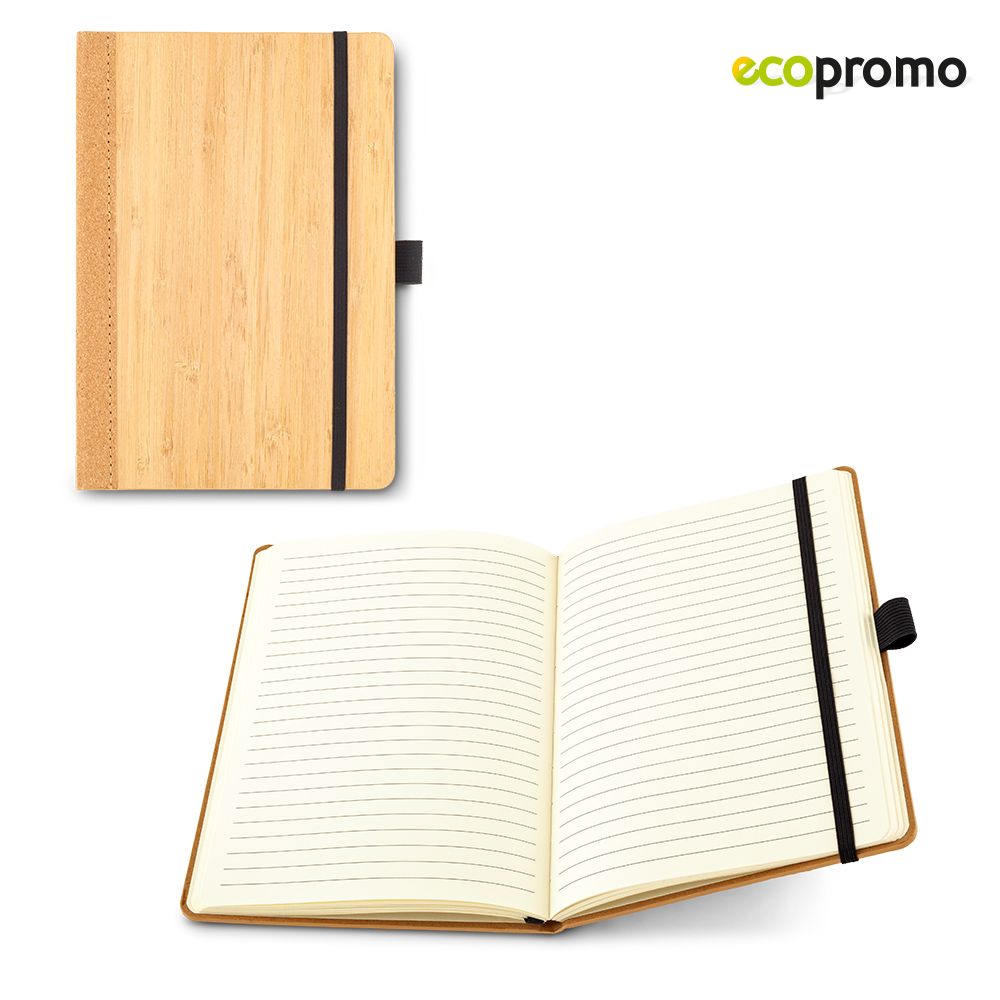 Libreta de 80 hojas, papel con rayas. Cubiertas en bambú y corcho. Cierre elástico.