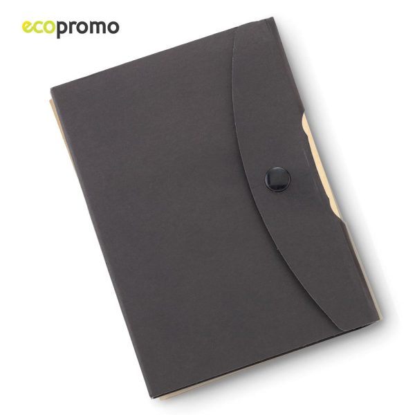 Libreta en cartón reciclable con botón de presión y bolígrafo; taco de 70 hojas rayadas, taco de notas autoadhesivos y set de 5 stickies de colores.