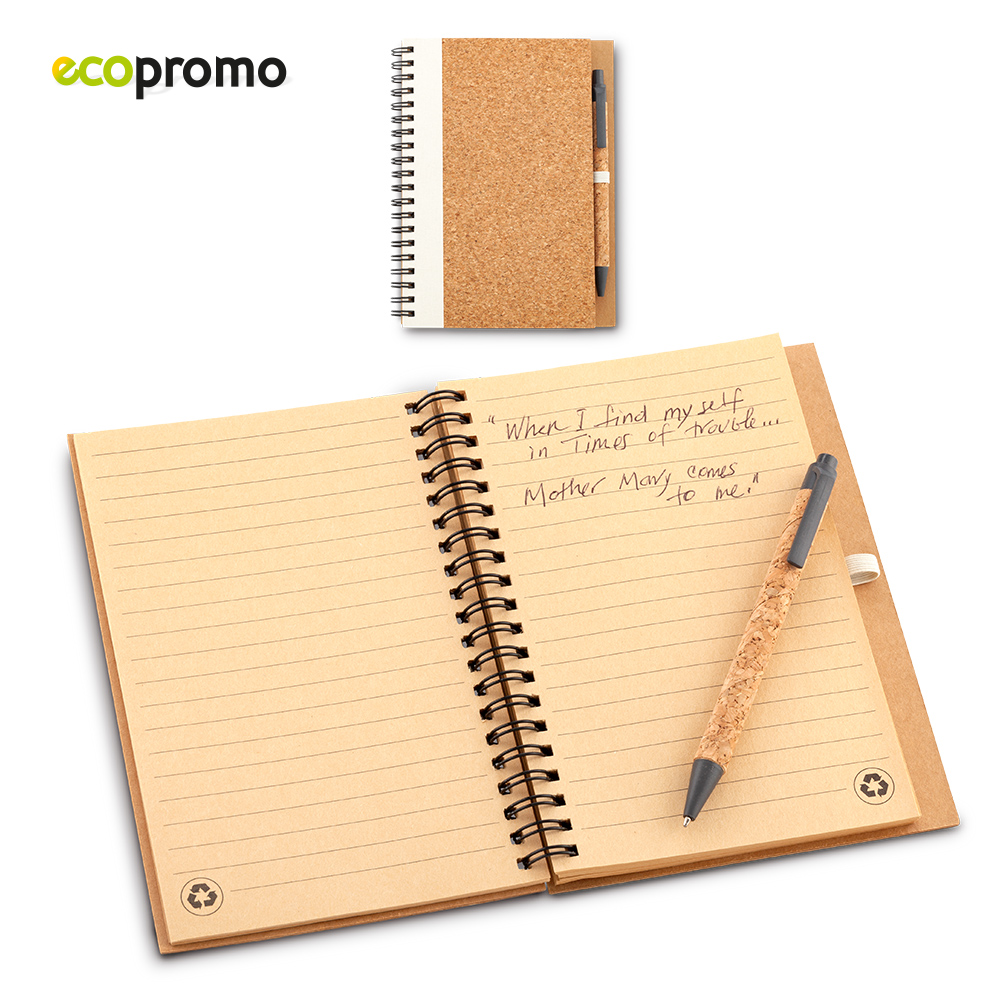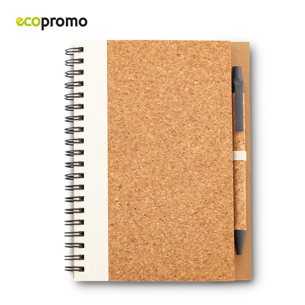 Libreta de 70 hojas de 70g de papel natural con rayas, cubiertas en corcho con cierre elástico, Incluye bolígrafo ecológico con barril en corcho y partes en plástico ABS, Mecanismo Push.