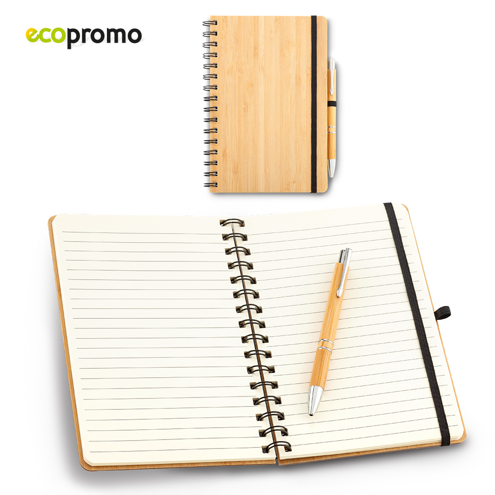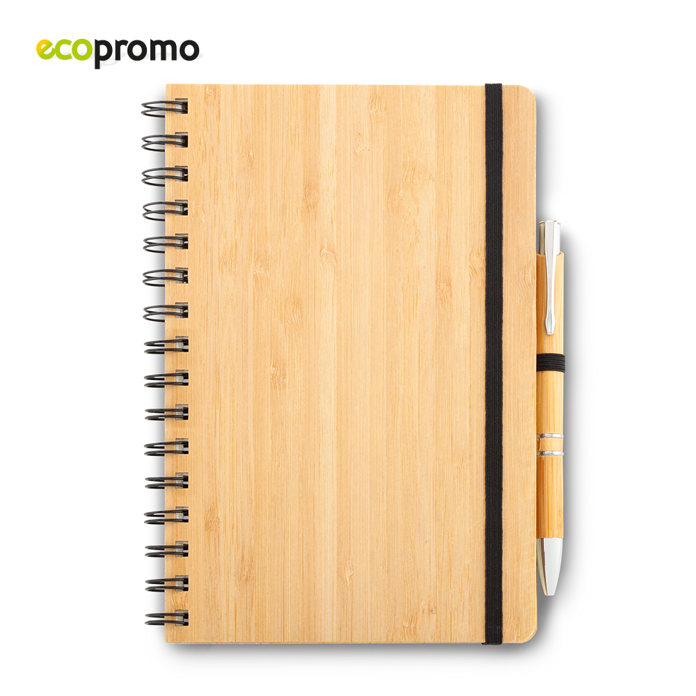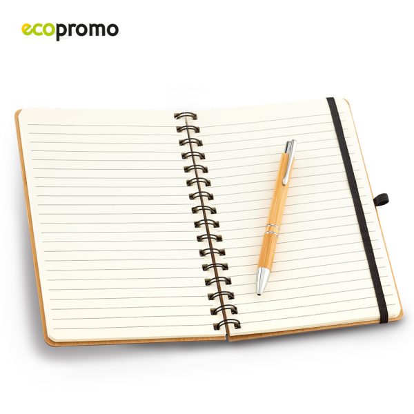 Libreta de 80 hojas de 70g de papel natural con rayas, cubiertas en bambú con cierre elástico, Incluye bolígrafo ecológico con barril en bambú y partes en plástico ABS, Mecanismo Push.