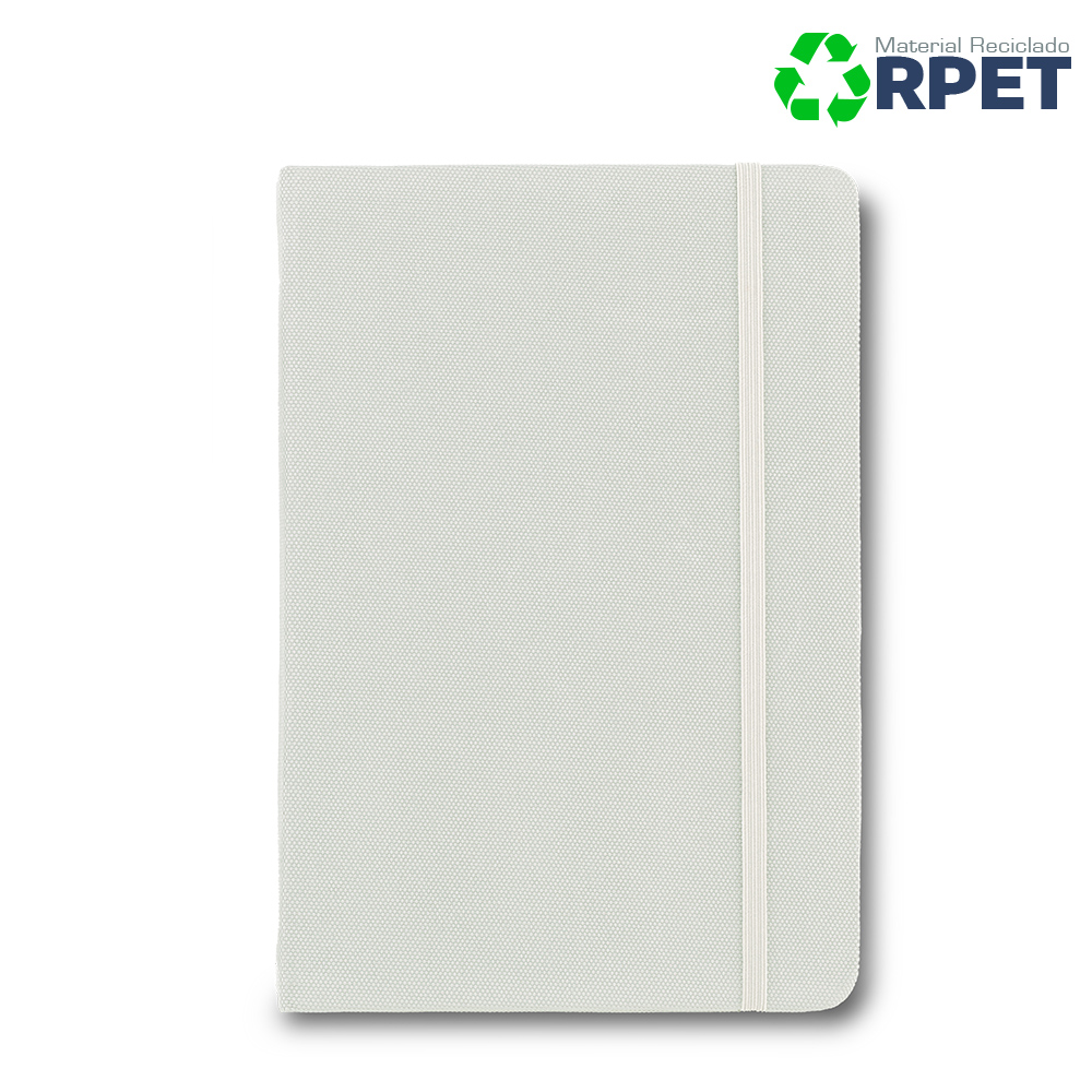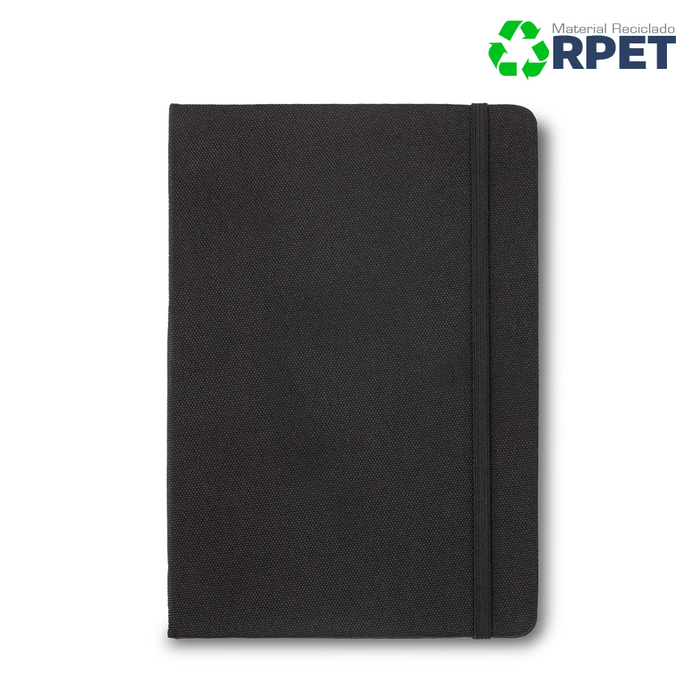 Cubierta elaborada en poliéster reciclado hecho a partir de la reutilización de botellas plásticas, 80 hojas de papel crema de 70g con rayas.