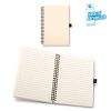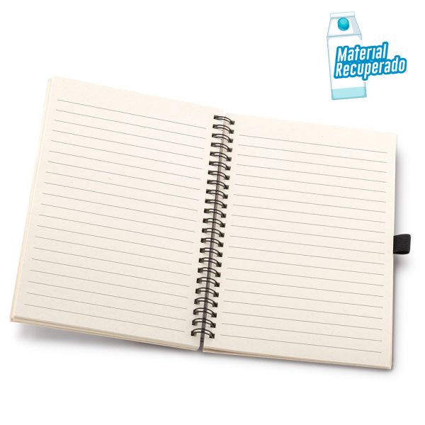 Libreta de 70 hojas con rayas, papel natural de 80g. Papel y cubiertas de cartón elaboradas en material recuperado a partir de cajas de leche.