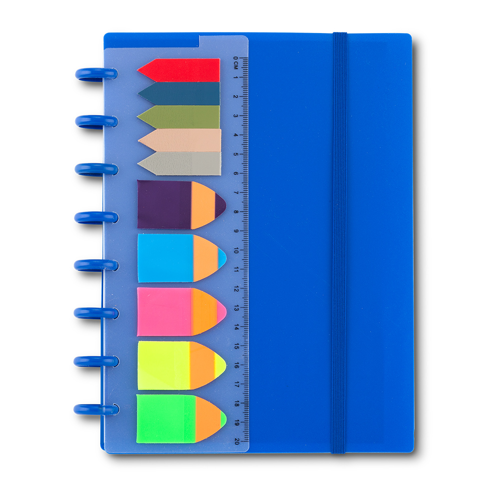 Libreta con cubiertas en polipropileno, 60 hojas de papel color blanco con rayas. Cierre elástico. Con 10 stickies de colores surtidos y regla de 20 cm.