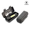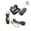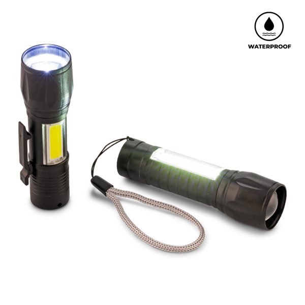 Linterna plástica de 1 LED 3W/80, luz lateral de 3W/130. Moviendo la cabeza de la linterna se puede hacer zoom in o zoom out para mayor precisión al momento de alumbrar. Resistente al agua. Entrada para carga tipo Micro USB. Incluye cable para cargar la batería. Estuche plástico.