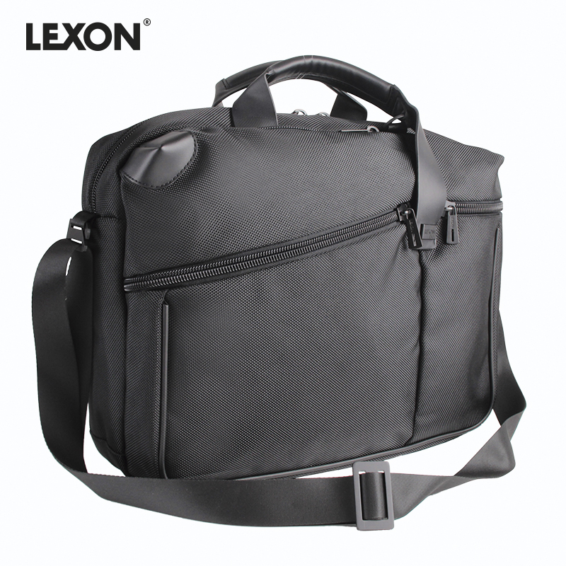 Maletín en poliéster 300D, con compartimento para portátil y tableta, bolsillos internos y portatarjetas, 4 bolsillos externos con cierre de cremallera y manija en cuero.